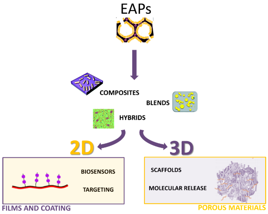In consideration of the growing interest of the scientific community for the development of synthesis and doping strategies for EAPs, we propose an overview of current trends on the use of EAPs in biomedical applications, mainly correlating the chemical features of different EAP classes to their specific functionalities. This approach aims at suggesting the most appropriate conductive polymers/processes to be used for the fabrication of on-demand systems (i.e., scaffolds, biosensors, drug delivery systems) as a function of the specific applicative demands.