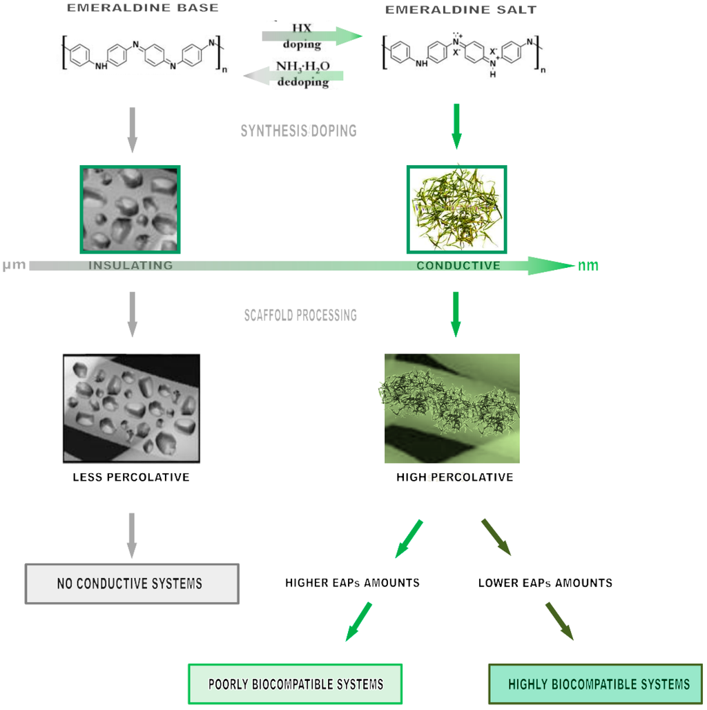 Schematic description of the biocompatibility of conductive platforms including EAPs: How conductive phase morphological features (i.e., shape, amount) can influence the transfer mechanisms of electrical signals.