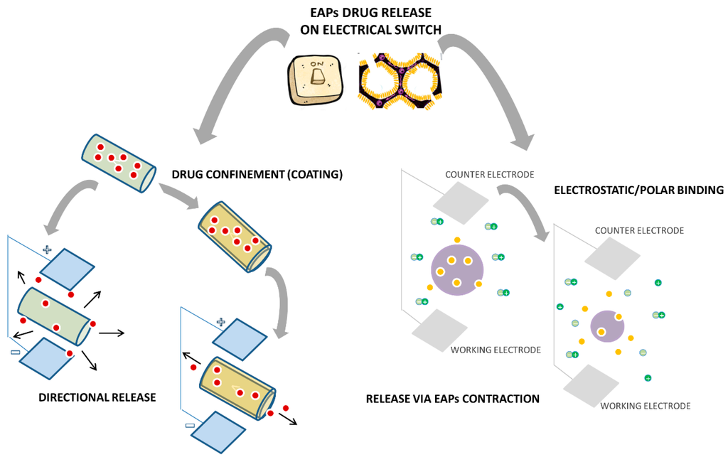 More recently, several efforts have been focused on engineer stimuli-responsive EAP devices with customized release of therapeutic molecules according to specific cellular or extracellular stimuli triggered via chemical, biochemical, or physical means. During the release mechanism, several changes in the nanocarrier structure or chemistry may occur, which drastically influence the release of the therapeutic payload as a function of the peculiar features of carriers and their interaction with biological environment stimuli. Accordingly, a recent study describes the on-demand, electronically controlled loading and Ibuprofen sodium salt release from a highly porous PPy layer onto carbon cloth electrodes [132]. In this case, all drugs are properly released upon application of either an oxidizing or reducing potential as a function of the peculiar polymer and drug polar groups. However, the opportunity to manipulate the release properties of EAP-based matrices from outside the body may involve the interaction with several “exogenous stimuli” including heat, light, electrical, magnetic or ultrasound signals [133]. This opens a real challenge to designing “on-demand release systems” able to minimize systemic toxicities and unfavorable drug-plasma interactions, in order to dose and more efficiently treat pathological, chronic or traumatic diseases