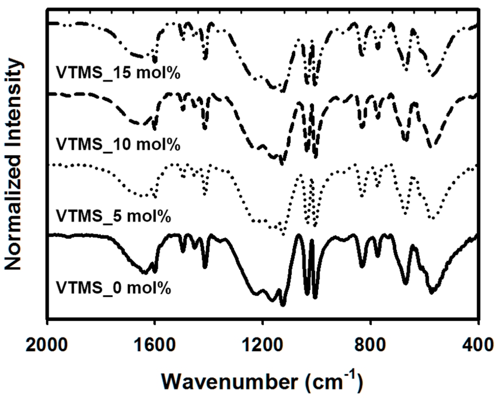The structural characterization of P(SS-co-VTMS) copolymers was done by FTIR (Bruker, Vortex 70, Seongnam-si, Korea) in the range 2,000–400 cm−1 with a resolution of 2 cm and nuclear magnetic resonance (NMR) (Bruker Biospin, Avance II, Seongnam-si, Korea) with a 400-MHz frequency. The samples for FTIR and NMR were dried in a vacuum oven at 150 °C with thermal curing. The FTIR analysis was performed on the powder state of P(SS-co-VTMS), mixed with KBr powder and palletized. A transmittance mode was used to obtain the FTIR absorption spectrum. The NMR analysis failed due to the insolubility of PSS copolymers. The thermal properties of solid-state copolymers were studied via a thermal gravimetric analyzer (Perkin Elmer, STA800, Seoul, Korea) at temperatures ranging from room temperature to 800 °C. To analyze the water contact angle, the PSS and P(SS-co-VTMS) films were fabricated via spin-coating on pre-treated glass substrates, which was followed by drying in the oven at 150 °C for 5 min.