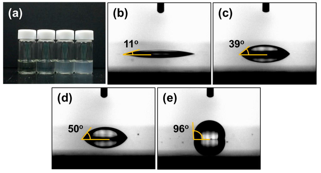 (a) Optical images of P(SS-co-VTMS) solutions and water contact angle images of PSS and P(SS-co-VTMS) films; (b) VTMS 0 mol%; (c) VTMS 5 mol%; (d) VTMS 10 mol%; (e) VTMS 15 mol%.