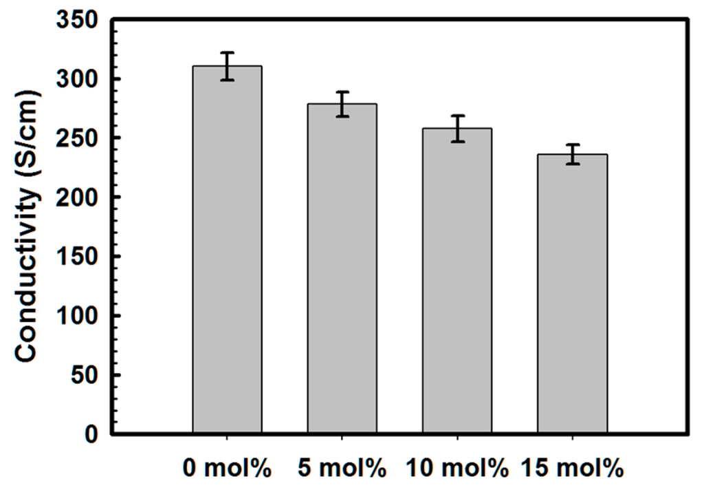 The conductivities of the synthesized polymers were calculated using the sheet resistance and thickness of the films. As shown in Figure 3, the conductivity of the films decreases linearly from 310.1 S/cm at PEDOT:PSS to 235.9 S/cm at PEDOT:P(SS-co-VTMS) with 15 mol % VTMS. Although the conductivity decrease was not high, it was observed that the introduction of VTMS into the PSS main chain affected the conductivity and other electrical properties, either through changes in its polymerization status or due to the influence on film formations. For increasing the conductivity of PEDOT:PSS, there are few things that should be discussed. The conductivity of PEDOT:PSS could be controlled not only by the intrinsic property of the polymer itself under controlling growth conditions, but also the post-treatment of PEDOT:PSS [,,]. As a result, the electrical properties should be analyzed with both points mentioned above.