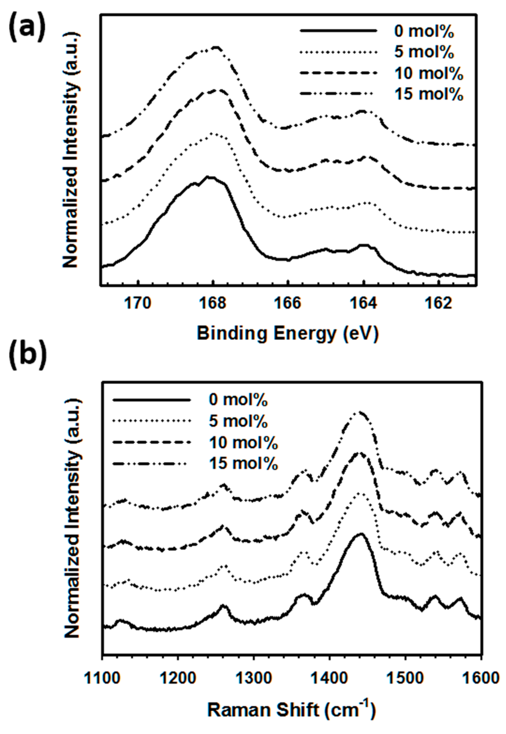 First, the growth of the PEDOT polymerization was studied via XPS using the spin-coated PEDOT:P(SS-co-VTMS) films treated with DMSO. As shown in Figure 4a, the XPS S 2p spectra were almost the same at all PEDOT conditions. The S 2p peaks for sulfur atoms were obtained at 167.6 and 163.9 eV with PSS and PEDOT, respectively [,]. The residue and by-products, including any unreacted EDOT monomers, were already removed by IET purification following the PEDOT polymerization. As a result, if the PEDOT growth increased, the intensity of the peak at 163.9 eV would increase; however, the intensity of the peak at 163.9 eV remained constant for all of the samples. In detail, the peak intensity at 163.9 eV slightly increased as VTMS content was increased from 0–15 mol%, because as the ratio of PSS to PEDOT decreased following the increase in the VTMS content, the sulfur content in the copolymer also decreased. The calculated ratio almost correlated with the content ratios. As a result, it was concluded that the introduction of VTMS did not affect the polymerization of PEDOT.