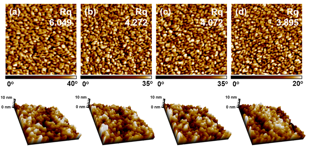 For the confirmation of the last assumption, the AFM images were analyzed. Generally, the DMSO treatment increased the conductivity of PEDOT:PSS films through three possible mechanisms: phase separation between PEDOT and PSS, the swelling effect on the PEDOT domain and the reorientation of the PEDOT structure. For this study, all three mechanisms can be ignored because of the silane connection caused by VTMS. As shown in Figure 5, the phase image of PEDOT:P(SS-co-VTMS) can show the separation and structural arrangement between PEDOT and PSS: the bright (positive) and dark (negative) phase shifts correspond to PEDOT-rich grains and PSS-rich grains of PEDOT:PSS films []. We observed that the positive grains of the films were slightly decreased as the VTMS content was increased, as verified by the decreased Rq of the films, from 6.049 at PEDOT:PSS to 3.895 at PEDOT:P(SS-co-VTMS) at 15 mol %. In addition, the topographic images and roughness of the films did not show any differences, with similar good coating abilities. These findings were the same as previous research, showing the development of compact thin films structure, as well as PEDOT-rich granular networks, causing larger contact areas between oriented PEDOT grains. These results explained that the phase separation was highest with the pristine PSS and linearly decreased as VTMS content was increased, i.e., smallest at VTMS 0 mol % and highest at VTMS 15 mol %, owing to the introduction of P(SS-co-VTMS).