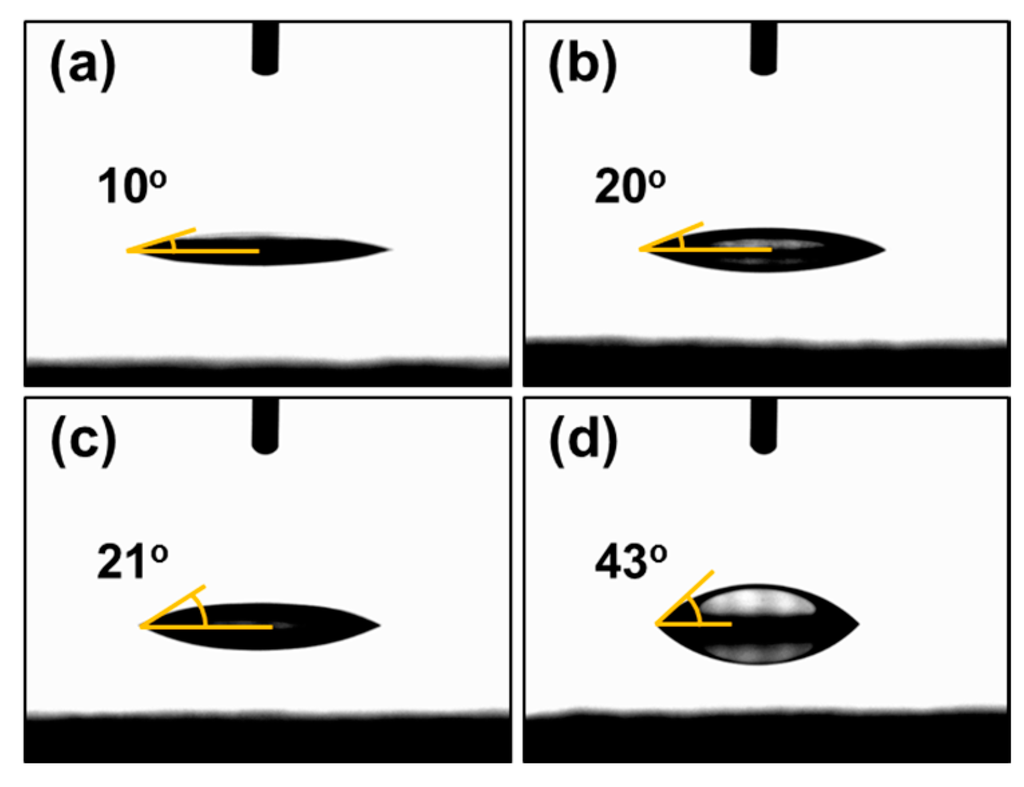 Water contact angle optical images of PEDOT:PSS and PEDOT:P(SS-co-VTMS) films with DMSO solution treatment. (a) PEDOT:P(SS-co-VTMS) 0 mol%; (b) PEDOT:P(SS-co-VTMS) 5 mol%; (c) PEDOT:P(SS-co-VTMS) 10 mol%; (d) PEDOT:P(SS-co-VTMS) 15 mol%.