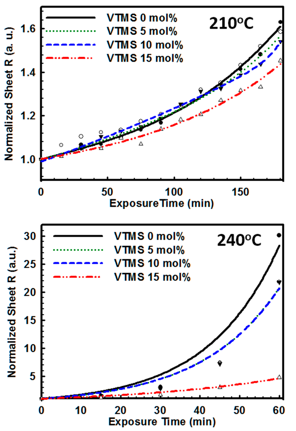 To test the thermal stability of PEDOT films after the adoption of VTMS, the conductive films were exposed to high temperatures at 210 °C and 240 °C. For the aging test performed below 200 °C, it was observed that the films were stable without thermal damage, as indicated by a resistance increase. However, as shown in Figure 7, in the aging test performed above 200 °C, the sheet resistance of both the PEDOT:PSS and PEDOT:P(SS-co-VTMS) films significantly increased in only 2 h. For the thermal exposure test performed at 210 °C, the resistivity of films linearly increased by more than 50% in only 2 h. The increase in resistance was maximum for PEDOT:PSS and minimum for PEDOT:P(SS-co-VTMS) with 15 mol % VTMS. However, in the 210 °C test, a clearly distinguishable difference was not observed. To create more harsh conditions, the films were exposed to a thermal treatment at 240 °C. It was observed that the resistivity of the films exponentially increased. In this test, the differences between each sample could be measured, as changing from 480% at PEDOT:P(SS-co-VTMS) with 15 mol % VTMS to 3012% at PEDOT:PSS. The introduction of silane into the PSS chain resulted in a sharp increase in the thermal stability of PEDOT:PSS films. The thermal stability of the films was dramatically increased with the increase in the VTMS content, especially in harsh conditions, because the silane coupling agent increased the thermal stability of the PSS copolymer (Figure S2) []. Furthermore, after aging of the films, the ratio between PSS and PEDOT remained as the VTMS content increased in the P(SS-co-VTMS) conditions (Figure S3). As a result, the thermal stability increased with the introduction of VTMS, maintaining the structure of PSS relatively.