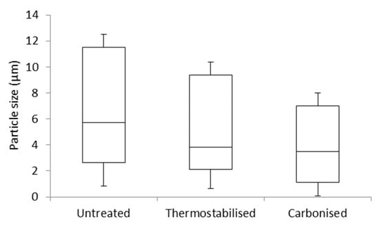 Particle size distribution of untreated, thermostabilised and carbonised organosolv lignin particles (outliers are not displayed; the box and whisker diagram is based on the minimum (lower whisker), the first quartile (bottom edge), the median (centre line), the third quartile (upper edge) and the maximum (upper whisker)).