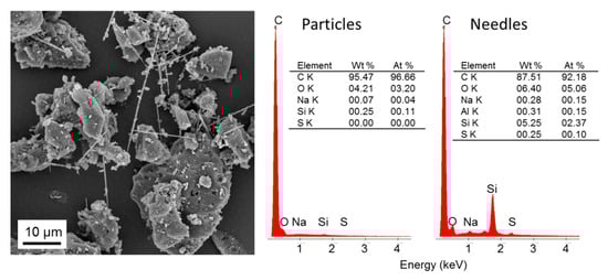The EDX results shown in Figure 3 confirm extensive carbonisation of lignin after treatment at 2000 °C, with more than 95% of sample mass converted to carbon. Besides oxygen and a trace of sodium, a small amount of silica was also detected. According to the silicon content of the parent material which was determined with 0.04 at % and the total mass yield of 19% there is a calculated total maximum of 0.2% silicon, which is in the same order of magnitude as EDX results. In good agreement with the fact that silica was detected in the carbonisation product, scanning electron microscopy revealed the presence of needle-shaped crystallites among the formed carbon particles (Figure 3). In these needles, reduced carbon content of 92.18 at % and oxygen and silicon contents of 5.06 at % and 2.37 at %, respectively, were found.