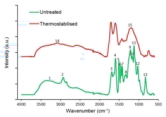 After thermostabilisation, the FT-IR spectra lack peaks at bands (1) and (2) indicate a reduction of phenolic or alcoholic groups, and removal and methyl groups, respectively. In parallel, band (14) at wavenumber 3073 cm−1, associated with aromatic hydrocarbon, increases in intensity in the thermostabilised variant. In the fingerprint region, a very significant increase is seen in band (3) associated with the stretch of unconjugated carbonyls, probably an indicator for rearrangement and radical reactions with introducing oxidised structures to the lignin. Furthermore, the number of distinct bands in the spectral region between 1500 and 700 cm−1 is much reduced, with a broad peak remaining at position (15) at 1199 cm−1. This change in spectral features shows that carbonyl groups and methoxyl were removed during autoxidation reactions. Furthermore, crosslinking reactions in the C5 position of g-lignin units occur during the thermostabilisation. In summary, it can be said that there occurred dehydration and oxidation as well as carbonyl group formation and elimination during thermostabilisation in parallel to a decomposition of aliphatic units [,,,].