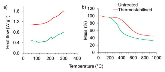 Differential scanning calorimetry (DSC) and thermogravimetric analysis (TGA) were conducted to examine whether the thermostabilisation was effective in terms of eliminating thermoplasticity of the raw material. The DSC graphs of both untreated and thermostabilised lignin show an exothermal behaviour during heating from ambient temperature up to 300 °C (Figure 5a), which is more pronounced in the thermostabilised lignin compared to the untreated sample. A small but clear local minimum in the DSC curve of the untreated sample at a temperature of 230 °C indicates softening. As this local minimum vanishes entirely after thermostabilisation, this procedure is expected to be efficient in terms of preventing thermal fusing of the lignin during carbonisation.