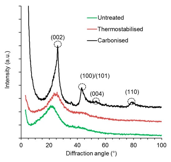 Structural alterations of organosolv lignin as a result of thermostabilisation and carbonisation were confirmed by X-ray diffractometry (Figure 6).