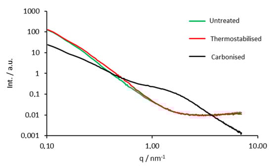 In conclusion, the conducted SAXS experiments confirmed that the parent lignin powder had no defined pore structure at the nanoscale. Thermostabilisation did not alter the nanostructure significantly, only a slight increase of specific surface and indication for a somewhat higher nanoporosity was found (higher scattering intensity at respective q values). After carbonisation the material shows a clear pore structure, corresponding to the appereance of a distinct shoulder in the scattering curve, attributed to a pore size of about 1 nm and an increase of the specific surface by a factor of six (770 m−2·cm−3), compared to the thermostabilised sample. The decreased exponent of the power law in the Porod regime of the scattering curve can be related to a higher surface roughness of the material.
