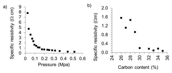 The specific electrical resistivity of the carbonised lignin particles was determined to evaluate their potential application for imparting organic polymers electro-conductivity. It can be seen in Figure 8 that the specific resistivity of carbon particles obtained in this study is in the range of 0.079 Ωm under atmospheric pressure, and 0.001 Ωm at a pressure of 0.51 MPa (Figure 8a). The resistivity diminishes with higher pressure. These findings are in good agreement with recent studies of electrical conductivity of carbon based particles derived from lignin [,,,]. It is known that heteroelements on the surface of carbonaceous materials can decrease total conductivity []. As mentioned, the carbon particles obtained in this study consisted of 96.66 at % of carbon and 3.20 at % of oxygen (cf. Figure 3). In comparison, carbon black particles obtained in a very similar way were reported to have an electrical resistivity of 0.004 Ωm under atmospheric pressure up to 0.025 Ωm at a pressure of 0.48 MPa, with a resistivity highly dependent on the extent of structural homogeneity of the prepared carbon blacks []. Increasing structural homogeneity generally translates into decreasing resistivity.