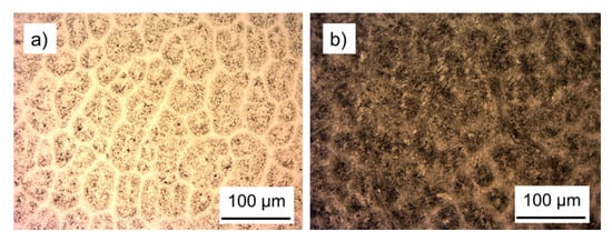 Optical micrographs of PLA films with 10% filler content showing (a) poor dispersion of carbon particles after casting from solution and (b) improved dispersion after repeated hot-pressing.