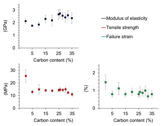 Tensile testing of PLA specimen loaded with different amounts of carbon particles revealed that both tensile strength and failure strain decreased with the addition of carbon particles to a certain extent (Figure 10). The tensile strength dropped from 25 MPa for PLA without lignin particles to 13 MPa for PLA filled with 5% carbonaceous lignin powder. For PLA filled with 5%–35% of the carbonaceous powder, the tensile strength is almost steady. Failure strain also decreased. Without carbon filling it was about 1.5%. After adding only 5% lignin derived carbon, the failure strain fell to 0.8%. Between 5% and 35% carbon loading, the failure strain was almost steady. Other studies found that the tensile strength increases with low loadings and decreases with high loadings. It was also found that the influence of carbon black particles differs a lot depending on the polymer matrix material []. In this case, agglomerates of the carbon particles can lead to imperfections in mechanical testing. The largest carbon particles, which were measured with 60 µm, can also lead to breakages.