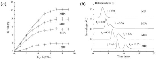 (a) Adsorption capacities of MIP, MIP, MIP, and NIP; (b) Chromatograms of chiral separations of d-Phe and l-Phe with MIP, MIP, MIP, and NIP as stationary phase, respectively. MIP used MAA as the functional monomer, MIP used acryloyl--cyclodextrin as the functional monomer, MIP used MAA and acryloyl--cyclodextrin as the binary functional monomer. NIP was employed without addition of imprinted polymer. The phenylalanine racemate solution concentration was 10 g/mL. The mobile phase consisted of 85% acetonitrile (containing 1.0% HAc) and 15% water. MIP: molecularly imprinted polymer; NIP: non-imprinted polymer. Adapted with permission from [66]. Copyright 2012 Elsevier.