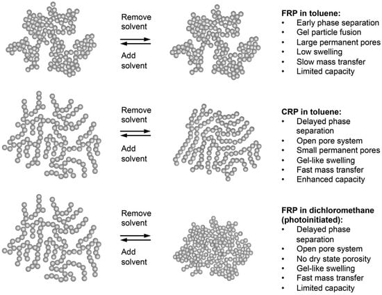 Pore systems deriving from different properties of imprinted network polymers prepared under different conditions. CRP: Controlled radical polymerization; FRP: Free radical polymerization. Reproduced with permission from [68]. Copyright 2015 The Royal Society of Chemistry.