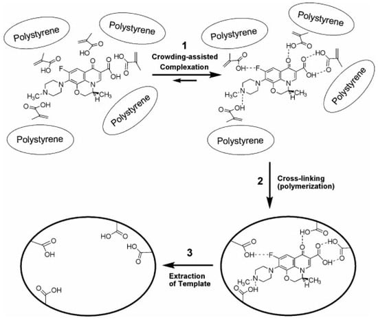 Schematic representation of molecular imprinting under molecular crowding conditions. S-ofloxacin (a template molecule) was mixed with methacrylic acid in tetrahydrofuran with polystyrene as a macromolecular co-solute. Then S-ofloxacin was cross-linked with ethylene glycol dimethacrylate by heating. After the polymerization, template was removed from the matrix and left a binding site. Reproduced with permission from [76]. Copyright 2011 Wiley.
