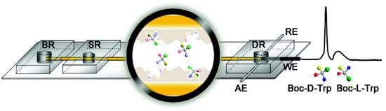 Schematic representation of the enantioseparation of chiral compounds on a MIP-coated microchannel of a microfluidic device. The MIP-coated microchannel in the microfluidic device was first washed by methanol/acetic acid (9:1, v/v), which was filled in the buffer reservoir (BR) and detection reservoir (DR). The fracture sampling was performed under a voltage of 200 V between the sample reservoir (SR) and BR. The corresponding separation voltage was applied to the BR with the DR grounded and the SR floating by automatically switching the high-voltage contacts. Finally, the electropherogram was recorded on a electrochemical station, using the “amperometric i–t curve” mode at an applied potential of +1.2 V. WE, working electrode; RE, reference electrode; AE, auxiliary electrode. Reproduced with permission from [93]. Copyright 2009 American Chemical Society.
