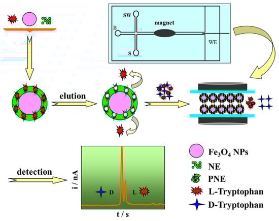 Recently, it has become a trend to combine MIPs with microchip electrochromatography (MCEC) for the faster enantioseparation of chiral drugs and biomolecules. Qu et al. [93] applied MIP into microchip electrophoresis (MCE) for fast enantioseparation of model enantiomers, tert-butoxycarbonyl-d-tryptophan (Boc-d-Trp) and Boc-d-Trp (see Figure 5). The MIP preparation was conducted on the inner wall of a microchannel by in situ polymerization. Acrylamide (AM) and ethylene glycol dimethacrylate (EDMA) were used as a functional monomer and cross-linker, respectively. The highly porous polymer film linked to the inner wall provided efficient interaction between the target molecules and the MIP. Molecular recognition to Boc-Trp enantiomers was proven to be efficient in the MIP-coated microchannel of microfluidic device (MIP-MCMD), presenting a baseline enantioseparation. Importantly, the analysis procedure was found to be reproducible and stable. Compared with conventional molecular imprinting techniques, the advanced method showed highly shortened analytical time, and less reagent and sample consumption. Subsequently, a microporous monolithic imprinted microchannel was fabricated for fast and sensitive chip-based enantioseparation [81]. Plentiful through pores were observed in the inner wall of imprinted microchannel. The resulting MIP monoliths presented excellent properties, such as large specific surface area, outstanding permeability, high flow rate, and efficiency. The imprinted capillaries were fixed in a poly dimethyl siloxane (PDMS) substrate on a glass slide. The rapid enantioseparation of racemic Tyr was realized with good resolution and high efficiency. Chen et al. [94] prepared a MIP-FeO@polynorepinephrine (PNE) nanoparticles stationary phase-based microchip electrophoresis system (see Figure 6). The addition of FeO into the MIP leads to easy collection and isolation by an external magnetic field, avoiding additional centrifugation or filtration processes. The resultant MIP-FeO@PNE presented an excellent enantioseparation property by combining the strong magnetism and high specific area of MIP-FeO with versatile groups and good biocompatibility of PNE. This microchip electrophoresis can be used to separate other kinds of chiral compounds by simply altering types of template molecules. On-chip separation of multiple chiral compounds can run simultaneously by simply mixing the MIP-FeO@PNE nanoparticles-based stationary phase with relative template molecules.
