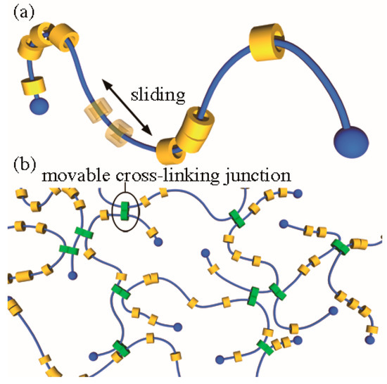 A slide-ring (SR) gel [1] was obtained by cross-linking cyclic molecules of different polyrotaxanes (PR) [2,3] that have cyclic molecules threaded along the axis of a polymer chain capped by bulky end groups (Figure 1). Having movable cross-linking junctions, SR gels have novel mechanical and swelling properties, such as high extensibility (over 20 times in length), huge swellability (up to 24,000 times by weight), and extremely low Young’s moduli [1,4,5,6,7,8]. The cross-linking junctions in SR gels can slide along the axis of the polymer chains unlike the cross-linking junctions in chemical gels. Therefore, internal stress is reduced by exchange between highly-extended and shrunken chains through cross-linking junctions, the so-called “spulley effect” [1]. Another crucial and unique feature of SR gels is the entropy of rings [9,10,11,12]. SR gels have small Young’s moduli that are not proportional to the cross-linking density and are much lower than those of chemical gels with the same density. This arises from the difference in the molecular mechanism of the entropic elasticity; that is, while the conformational entropy is mainly responsible for the elasticity of chemical gels, the mechanical properties of SR gels are inherently governed by the distribution entropy of free rings in the SR gel as well as the conformational entropy of the backbone polymer. The pulley effect and the entropy of rings are the causes of the various novel physical properties of SR gels, including anomalous stretching-induced swelling behavior [13,14], peculiar nonlinear elasticity [15,16], dynamic transition between rubber, sliding states [9,10,17], and pressure-induced nonlinear penetration flow properties of gel membranes [18]. Due to their novel physical properties and peculiar behaviors, SR gels are expected to be new functional soft materials.