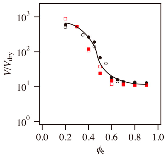 The degree of swelling V/Vdry of the carboxylated SR gels with cross-linking times of 1.45 h (circle) and 2 h (square) as a function of ethanol volume fraction, . Filled and open symbols denote shrinking and swelling processes, respectively. The solid line is an eye guide.