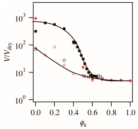 The degree of swelling V/Vdry of the carboxylated SR gels with cross-linking times of 2.7 h (circle) and 3 h (square) as a function of acetone volume fraction, . Filled and open symbols denote shrinking and swelling processes, respectively. The solid lines are eye guides.