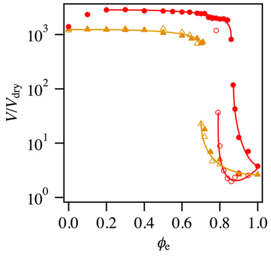 Figure 12 shows the degree of swelling of the carboxylated SR gels as a function of time when solvent was exchanged from 0.1 M NaCl aqueous solution to water and, back again, from water to 0.1 M NaCl aqueous solution. The carboxylated SR gels exhibit a solvent uptake greater than the equilibrium value (overshoot) during the swelling process, but not in the shrinking process. The overshoot was observed even in the shrinking process in acetone-water or ethanol-water mixtures, although it was not seen in the swelling process, as shown in Figure S9. Immediately after solvent is exchanged from = 0.20 to = 0.30, or from = 0.30 to = 0.40, the volume of the SR gel expands rapidly, and then shrank gradually and, finally, returned to the equilibrium state in several days.