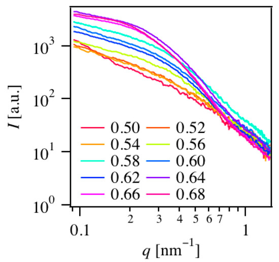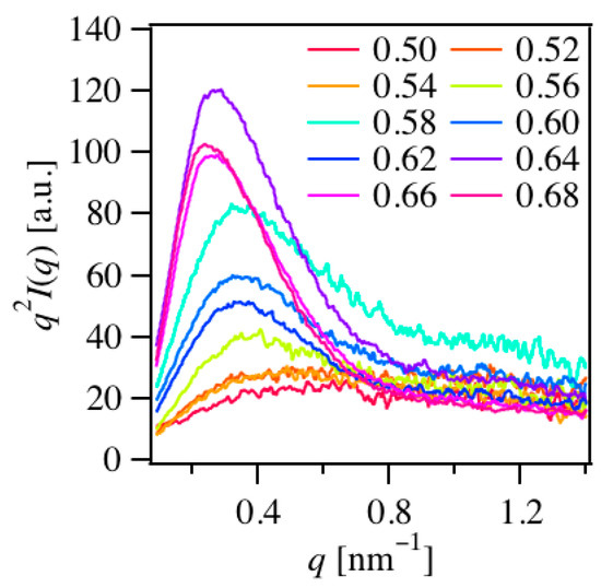 where A is the scattering intensity at q = 0 and ξ the length of correlation blob (Figure S5 in the Supplementary Material). This suggests that polymer chains in ≤ 0.54 behave as Gaussian chains. The profiles of the SR gels at higher acetone fractions ( ≥ 0.56) do not fit the Ornstein-Zernike function well. Therefore, we used a Kratky plot [33] q2I(q) vs. q, as shown in Figure 8. Obvious peaks appear in the Kratky plot for the range 0.56 ≤ ≤ 0.68, indicating the existence of some aggregated domains in the SR gel. These scattering profiles are fitted well by the Guinier function: