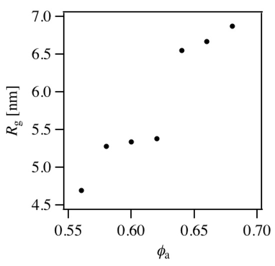 where Ig is the scattering intensity at q = 0 and Rg the radius of gyration of the domain (Figures S6 and S7 in Supporting Information). Figure 9 shows the dependence of Rg in the SR gels on in 0.56 ≤ ≤ 0.68, indicating the growth of the domain with increasing acetone fraction.
