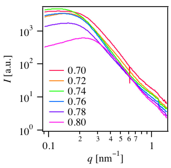 Circularly-averaged SAXS intensity profiles of the carboxylated SR gels at = 0.70–0.80.