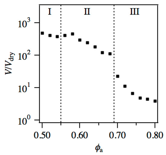 The degree of swelling V/Vdry of the carboxylated SR gels as a function of in shrinking process. From the SAXS profiles, the mesoscale structure of the SR gel can be classified into three regions (I–III).