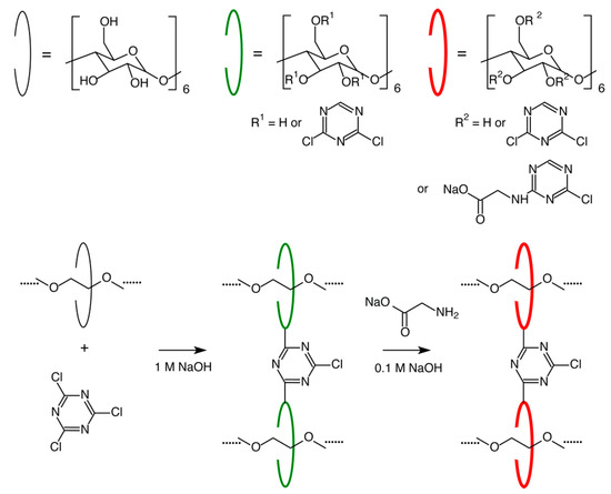 The cross-linking reaction of CDs in PRs with cyanuric chloride and the subsequent introduction of carboxylic acid groups to the SR gels. PEG is omitted here for simplification.