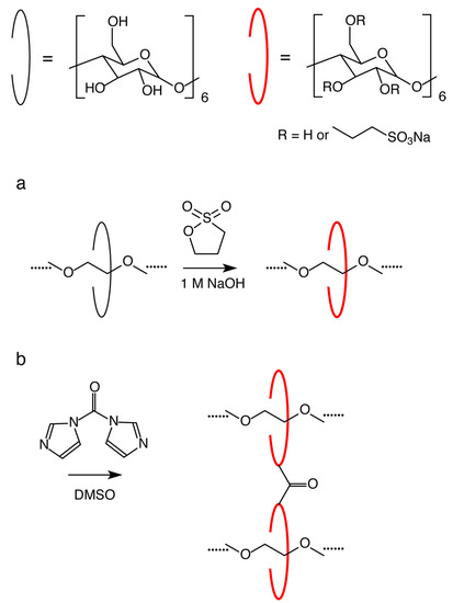 (a) Substitution of sulfo groups into polyrotaxane; and (b) cross-linking reaction of sulfonated polyrotaxane.
