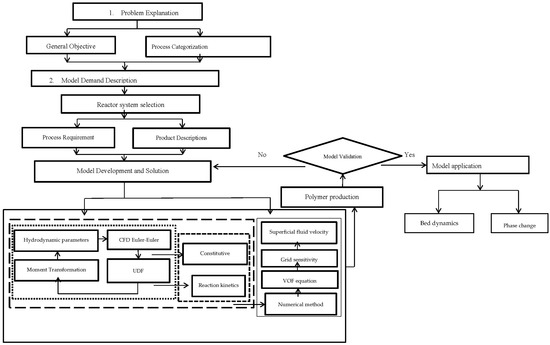 To correlate the turbulence, population balance and energy equations in a multi-fluid UDF framework, a systematic CFD reaction kinetic coupled modeling framework application of multiphase polymerization in the fluidized bed reactor was executed. The CFD-based coupled model constitutes a flexible platform. Hence, its applications can be expanded to different polydisperse multiphasic FBRs by altering the geometry and constitutive equation. The generic model comprises four main steps, as shown in Figure 1: