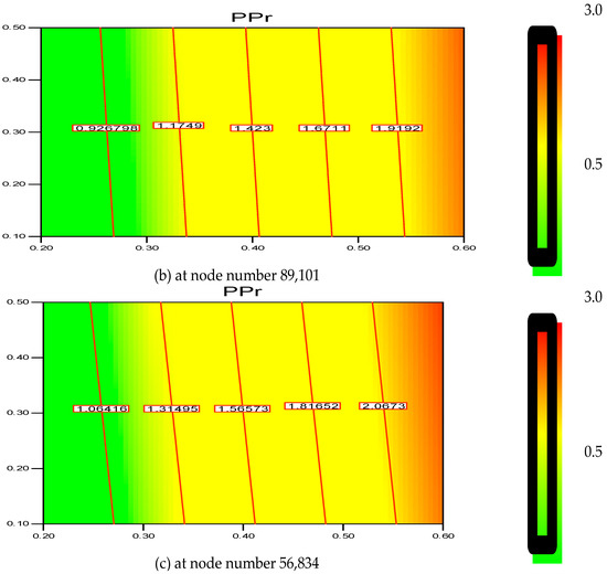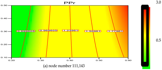 (a) Changes of the polymerization rate at node number 111,143 at various superficial gas velocities. Contour lines indicate the polymerization (%) changes; (b) Changes of the polymerization rate at node number 89,101 at various superficial gas velocities. Contour lines indicate the polymerization (%) changes; (c) Changes of the polymerization rate at node number 56,834, at various superficial gas velocities. Contour lines indicate the polymerization (%) changes.