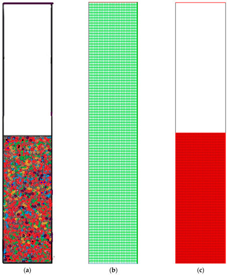 The greater the resolution, the more independent the grid outcome is. This was confirmed with the help of a two-dimensional (2D) analysis that employs the boundary-and-gradient adaptation technique. In this procedure, the adjoined mesh points could be present in high-gradient areas in the inlet and fluidization regions. The response variations at three mesh resolutions with 56,834, 89,101 and 111,143 node numbers are shown in Figure 2a–c. The parameters considered for the simulation include 1.5 m of bed height, 1000 s real time and 0.2 m/s superficial gas velocity. Figure 1 demonstrates the three separate grids used to divide the 2D flow domain into square cells. Hence, it can be said that grid resolution plays an influential role for the response, as evident in Figure 2a–c.