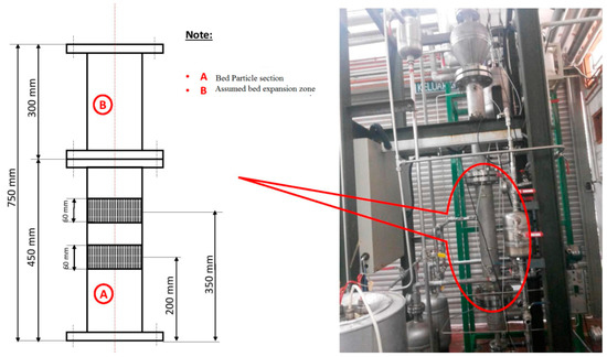 Image of the pilot-scale FBCR for polypropylene production where the experiments were conducted for this study (detailed dimensions have been shown in mm).
