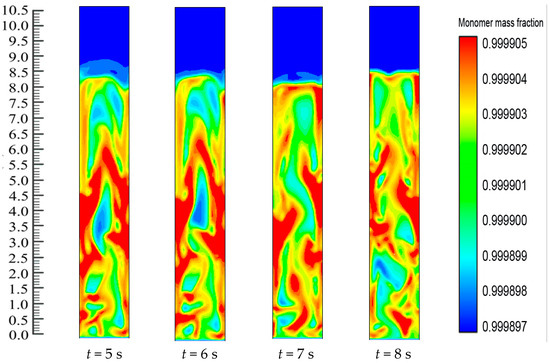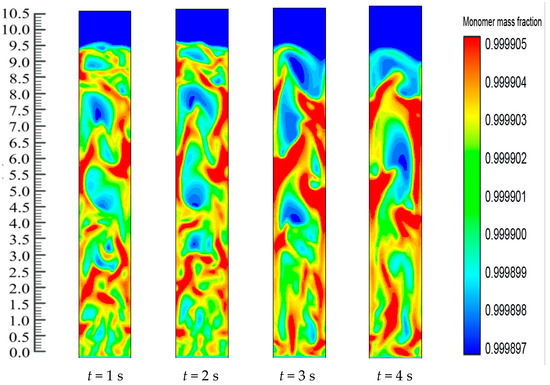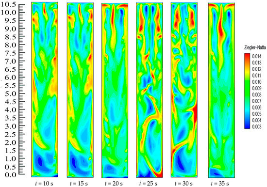 The operational performance of the Fluidized Bed Reactors (FBRs) depends on their capacity to execute many multiphasic chemical reactions, uniform fluid mixing, a higher rate of heat and mass transfers, and operating in a continuous state [1,2,3,4]. Consequently, a lot of interest has been generated by the propylene polymerization model in an FBR [5,6,7]. In the industrialized gas-phase polypropylene FBR, smaller particles of the Ziegler-Natta catalyst along with triethyl aluminium are continuously charged in the bed reactor and they react with the various reactants for producing a wide distribution of the polymer particles. Several studies have indicated that the foremost aim of engineering the gas-phasic olefin polymerization reaction is to comprehend the way the reaction mechanism works, along with studying the physical transportation process, the reactor configurations and the reactor operational conditions, which can influence the properties of the polymer product [8,9,10]. It should be noted that the polymer products in the FBRs exhibit several types of properties, such as the morphological property and the molecular property [10,11,12,13,14]. Generally, the polymerization processes are classified as homogeneous and heterogeneous processes. In the homogeneous polymerization process, the reaction takes place in a single phase, while the polymerization takes place in different phases in a heterogeneous process. Hence, the heat transfer, the inter-phasic mass transfer, and the chemical reaction are very important to study [15,16,17,18,19,20]. Moreover, the multiphasic properties are connected to the industrial-scale polymerization reactor behavior from the pilot scales and are greatly impacted by the operational conditions of the reactor, such as gas–solid flow fields (viz., the gas and the solid fractions). Due to this, detailed modeling describing the pilot-scale phenomenon is a very difficult task. The modeling of the pilot-scale FBR should take into consideration the complicated two-phase gas–solid flow, the interaction between the particles and the particle-reactor, along with microscale phenomena such as the chemical interactions and the kinetic reactions between catalyst-active sites and the molecular movement and particle collision. A multiphase reaction approach serves to solve the problems described above and establish the relation between the multiphasic polymerization rate and the operating conditions.