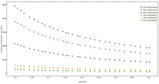 Though the polymerization mechanism is similar in both phases, the reaction rate between the bubble and the emulsion phase are very different. This is mainly because the dynamic two-phase model consists of varying concentrations of the solids in every phase and also differs in the amount of polymer present in the bubble (Vpb) and emulsion phases, which has been elaborated on in Section 4.2. Variations in the catalyst flow rates in the emulsion and the bubble phases result in differing reaction parameters for both the phases and influence the temperature, and production rate, along with the monomer conversion in these two phases. Applying the Eulerian multiphasic model along with the kinetic model helps in the analysis of the fluidized beds as certain mathematical hypotheses are important for developing the comprehensible reaction models, which are explained in further detail in the subsequent sections.