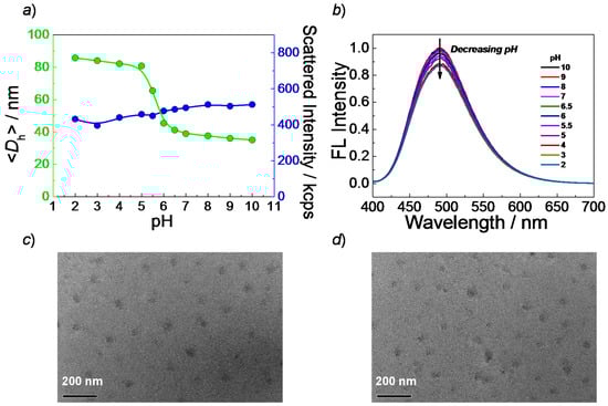 (a) Variations of hydrodynamic diameters, Dh, and corresponding scattered light intensity changes obtained for 1.0 g/L aqueous solution (BP2/BP3 = 9/1, wt %, 25 °C) of CCL(core cross-linked) micelles at varying pH values; (b) pH-dependence of normalized fluorescence emission spectra recorded for 1 g/L aqueous solution of the CCL micelles (25 °C, λex = 390 nm; slit widths: Excitation 5 nm, Emission 5 nm) with pH decreasing from 10 to 2. TEM images of CCL micelles at (c) pH 10 and (d) pH 2.