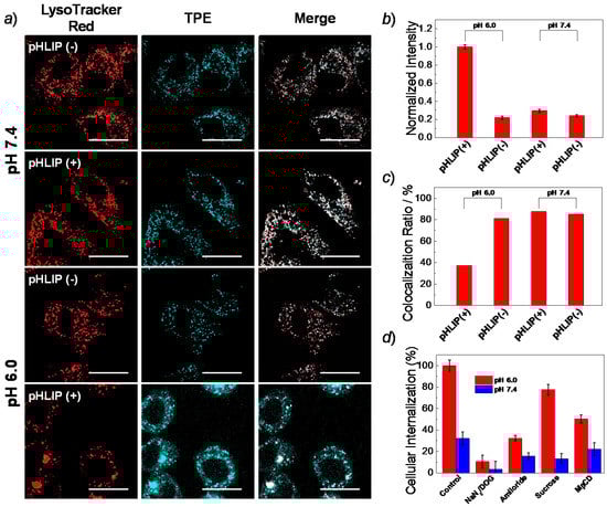 Next, we evaluated the cell internalization capability and examined the internalization pathways of CCL micelles by taking advantage of TPE fluorescence achieved by crosslinking micellar nanoparticles. Notably, although the fluorescence of CCL micelles slightly decreased at acidic pH (Figure 1b), it was bright enough to trace the CCL nanoparticles by confocal laser scanning microscopy (CLSM). To boost the intracellular uptake efficiency of CCL micellar nanoparticles, pHLIP targeting moieties were attached to the surfaces of micellar nanoparticles through the formation of imine bonds between targeting peptide and benzaldehyde residues. pHLIP can insert into lipid bilayers via the formation of α-helical structures under mildly acidic pH, thus enhancing the internalization of nanocarriers functionalized with pHLIP [,,,,,]. Although there were no significant changes in the fluorescence intensities of cyan channel for A539 cells after incubation either with the CCL micelles with targeting pHLIP at pH 7.4 or with CCL micelles without targeting pHLIP at both pH 7.4 and pH 6.0, pronounced fluorescence increase was observed for the A539 cells after incubation with CCL micelles with pHLIP at pH 6.0 (Figure 2a,b), suggesting an increased cellular accumulation of CCL nanoparticles. This result should be the contribution of targeting pHLIP on the micellar surfaces that form α-helical structures at pH 6.0, boosting the internalization of CCL nanoparticles. Additionally, quantitative colocalization analysis between the red channel of stained acidic organelles (e.g., endolysosomes) and the cyan channel of CCL nanoparticles revealed a lowest colocalization ratio (~40%) in the presence of targeting pHLIP at pH 6.0 (Figure 2b), while CCL micelles without pHLIP at both pH 7.4 and 6.0, and micelles with pHLIP at 7.4, exhibited similar high colocalization ratios (>80%). This result demonstrated that the internalized CCL micelles in the presence of targeting pHLIP at pH 7.4 and in the absence of targeting pHLIP at both pH 6.0 and 7.4 were primarily located within acidic organelles. However, CCL micelles with targeting pHLIP at acidic pH may circumvent the fate of nanoparticle-based delivery cargos that ends up in the endolysosomes, which was quite advantageous for the designing of efficient and robust nanocarriers.