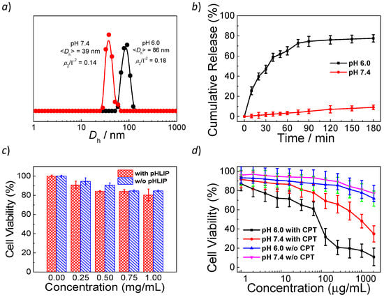 (a) Hydrodynamic diameter distributions of camptothecin (CPT)-loaded CCL micelles at pH 7.4 and pH 6.0, respectively; (b) CPT release profiles from CCL micelles at pH 7.4 and 6.0; (c) In vitro cytotoxicity of CCL micelles with and without pHLIP as determined by MTT (3-(4,5-dimethyl-2-thiazolyl)-2,5-diphenyl-2-H-tetrazolium bromide) assay against A549 cells at pH 7.4; and (d) in vitro cytotoxicity of pHLIP-decorated CCL micelles with or without CPT internalized under different pH as determined by MTT assay against A549 cells. For the cytotoxicity tests, A549 cells were firstly incubated with micelles for 2 h and were washed three time with PBS buffer, followed by a further incubation for 24 h.