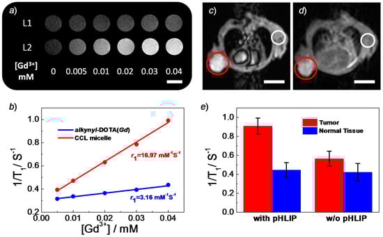 Building on the above results, we concluded that the pH-responsive CCL micelles with AIE characteristics and drug-loading capability could be employed as a fluorescence image-guided theranostic nanovector. Considering the presence of DOTA(Gd) contrast agents on the micelle surfaces, in the following work, we further appraised the MR imaging capability of the CCL micelles. Both DOTA(Gd) small molecules and mixed micelle-based macromolecular MRI contrast agent exhibited positive imaging contrast. The latter, however, possessed brighter contrast capability than for small molecular precursors at the same Gd3+ ion concentration, probably due to an increased local concentration and inhibited tumbling of DOTA(Gd) moieties []. Specifically, quantitative analysis revealed that the relaxivity (r1) of DOTA(Gd) small molecules and mixed micelle-based MRI contrast agents were of 3.16 and 16.97 mM−1·s−1, respectively. Note that the increased relaxivity was apparently advantageous for the in vivo imaging because of enhanced contrast. Tumor-bearing BALB/c nude mice with xenograft tumors of A549 cells were used for in vivo MR imaging, and the MR images were taken 30 min after intravenous injection of the aqueous solution of CCL micelles with or without pHLIP. It was revealed that pHLIP-labeled mixed micelles had a better imaging contrast than those without targeting peptides (Figure 4c,d), and the quantitative analysis of 1/T1 demonstrated that the CCL micelles with targeting peptides favorably accumulated within tumors instead of normal tissues (Figure 4e), as a result of the selectively targeting capability of pHLIP peptide under a mildly acidic circumstance typically observed in pathological regions (e.g., tumors). Taken together, the pH-responsive CCL micelles crosslinked with TPE moieties can not only intracellularly deliver therapeutic drugs with pH-dependent release profiles but also visualize the biodistribution and intracellular internalization process by means of MR and fluorescence imaging modalities.