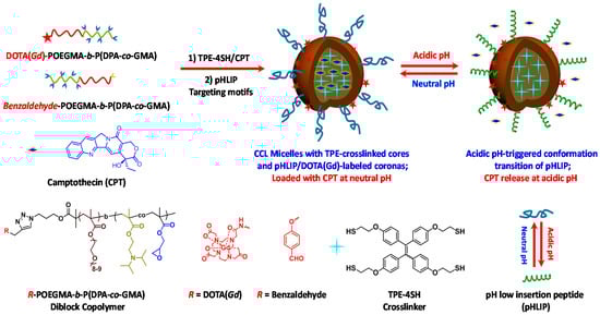 Schematic illustration of the fabrication of the CCL (core cross-linked) micelles with fluorescence and magnetic resonance (MR) dual imaging modalities from DOTA(Gd)-POEGMA-b-P(DPA-co-GMA) and benzaldehyde-POEGMA-b-P(DPA-co-GMA) diblock copolymers and tetrakis[4-(2-mercaptoethoxy)phenyl]ethylene (TPE-4SH) fluorophores via co-assembly and the spontaneous thiol-epoxy click chemistry. The CCL micelles were further functionalized with pH-low insertion peptide (pHLIP) through the formation of Schiff base linkages, followed by reduction with sodium cyanoborohydride (NaBH3CN). Under neutral pH condition, the pHLIP was in a coil state while it was transformed to α-helical conformation under mildly acidic pH, leading to increased cellular internationalization and allowing for fluorescence and MR imaging in live cells. Simultaneously, pH-triggered protonation of DPA moieties led to the release of encapsulated camptothecin (CPT) drug. Red stars: DOTA(Gd) moieties; arrows: TPE fluorophore; diamond: CPT drug.
