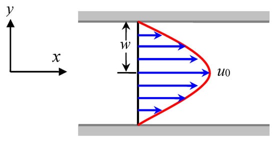 Schematic diagram of the steady-state plane Poiseuille flow. The blue arrows show the flow direction as well as the corresponding strength, the red curve represents the velocity profile, w and u0 are respectively the half width of the tube and middle axis velocity.