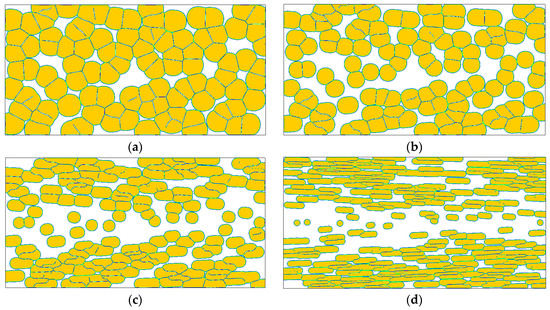 It is foreseeable that the changes of nucleation caused by flow treatment will certainly affect the later crystal growth. Figure 5 shows the crystallization morphologies obtained by our model for a set of flow strengths. In carrying out these simulations, the anisotropic growth of the crystal interface was not taken into consideration, i.e., ε = 0. As has been discussed in the modeling sections, influence of flow on polymer crystallization is twofold, one is on morphology and the other is on kinetics. Because our attention was mainly focused on the morphology, the results shown in each figure are adapted to ensure similar sizes of crystallized regions for comparison. From Figure 5, it is evident that flow has important influence on the crystallization morphology. Under weak flow treatment (Figure 5a), spherulites are obtained throughout the simulation region, and the results show almost no difference with those obtained under quiescent conditions [28]. As the flow strength is intensified, the spherulites near the skin layer in Figure 5b begin to present elliptical outlines, and in Figure 5c the morphology is much different to that shown in Figure 5a. Further, in Figure 5d the morphology is transformed from spherulites to oriented crystals. In the literature, similar results were obtained from experimental observations [38,48].