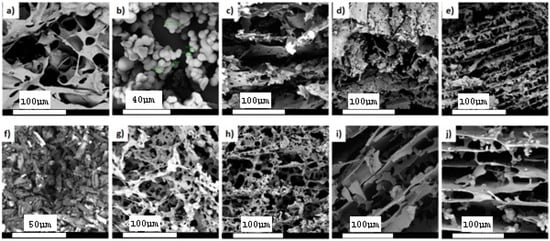 SEM images before immersion in Simulated Body Fluid (SBF) of (a) PCL/PAA blend; (b) silica microspheres; (c) PCL/PAA/S1 blend; (d) PCL/PAA/S2 blend; (e) PCL/PAA/S3 blend; (f) CFX; (g) PCL/PAA/CFX blend; (h) PCL/PAA/S1/CFX blend; (i) PCL/PAA/S2/CFX blend, and; (j) PCL/PAA/S3/CFX blend.