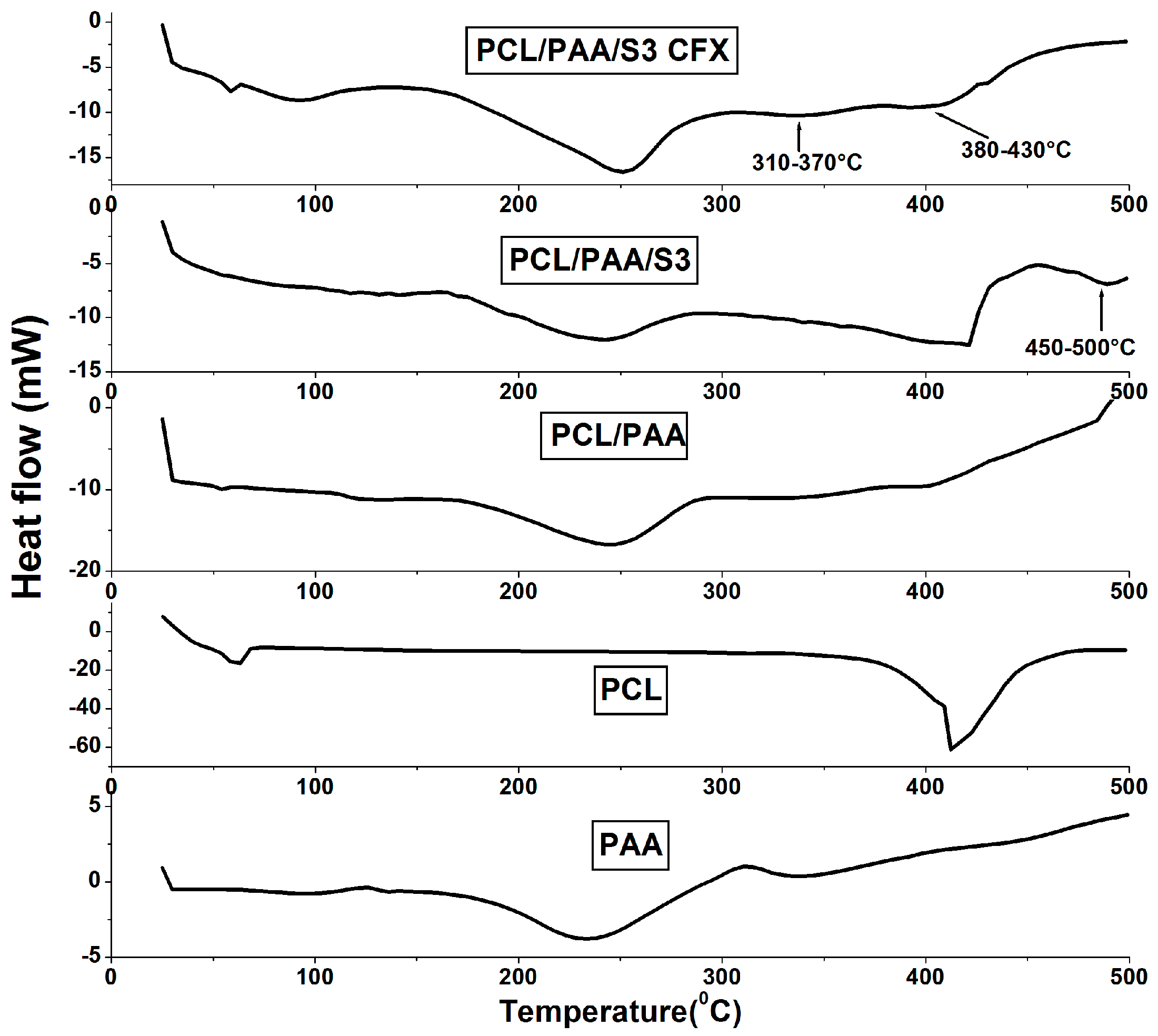 Figure 2 shows the thermal behavior of the scaffolds before and after the individual loading of silica microspheres and CFX. The thermogram of all scaffolds exhibited identical thermal behavior of native PAA, confirming its domination except for the endothermic broad peak at 380–430 °C. This peak was attributed to the presence of the PCL. Silica microspheres-loaded scaffolds had an identical thermal pattern with increased intensity for the PCL peak. This result was due to the overlapping of the PCL peak with the Tg peak of silica microspheres. The silica microspheres Tg peak was recorded at 450–550 °C as reported for silicate glass [12]. The exothermic peak observed at 310–370 °C corresponded to the new intermolecular hydrogen bonds that occurred between the PCL/PAA blend and the CFX for scaffolds loaded with CFX [13]. The DSC results confirmed the domination of PAA and the successful entrapment of both silica microspheres and CFX into the PCL/PAA blend with the thermal integrity of the polymer backbones maintained.