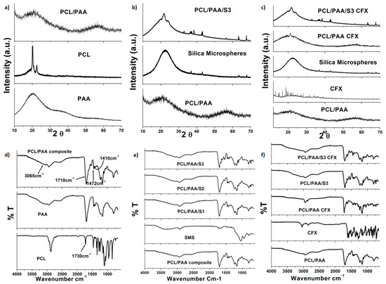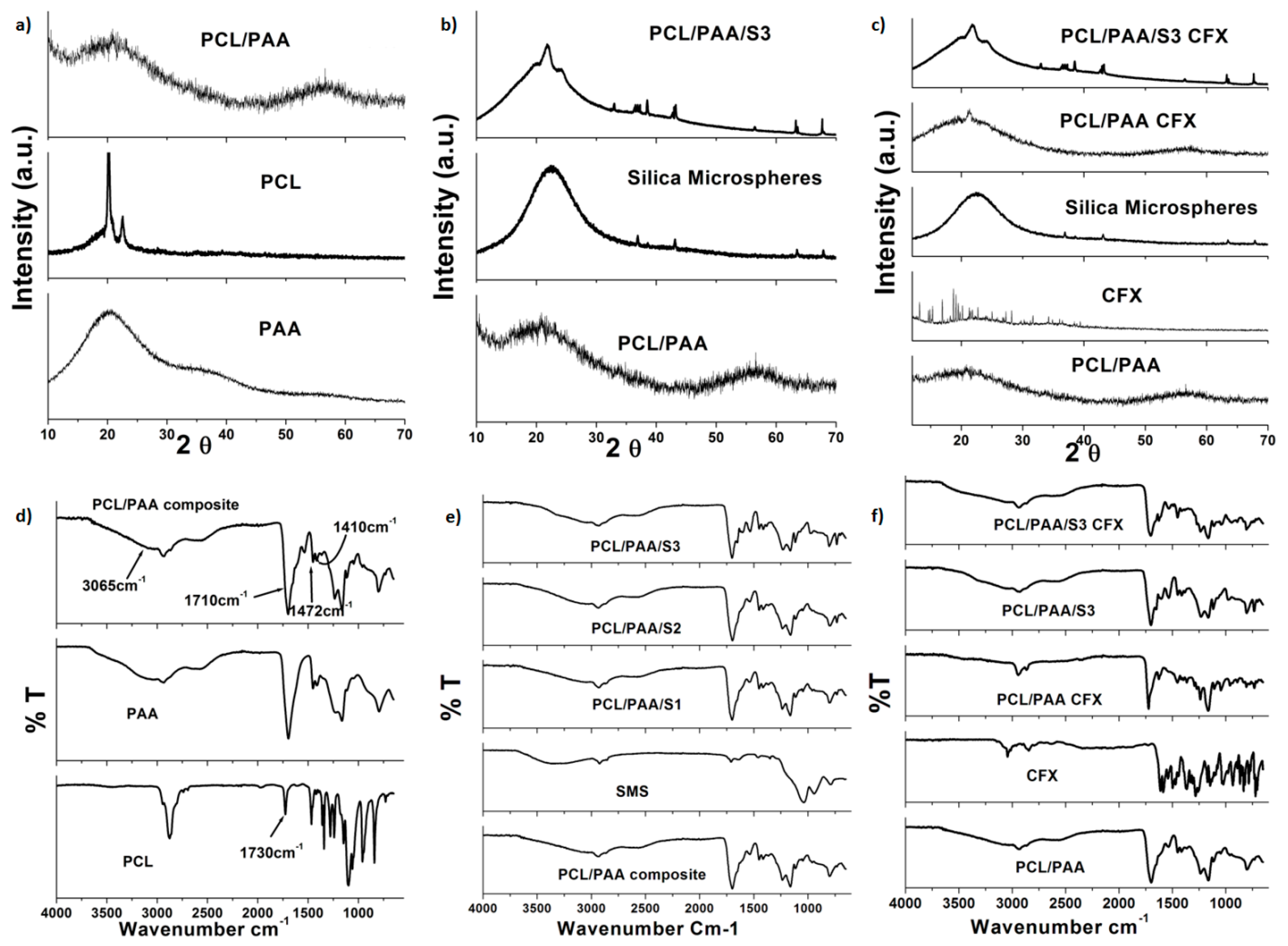 X-ray diffraction (XRD) patterns of (a) blending of PCL with PAA; (b) incorporation of silica microspheres into PCL/PAA blends; (c) encapsulation of CFX into the PCL/PAA blends and Fourier Transform Infrared (FTIR) spectra of; (d) blending of PCL with PAA; (e) incorporation of silica microspheres into PCL/PAA blends; (f) encapsulation of CFX into the PCL/PAA blends.